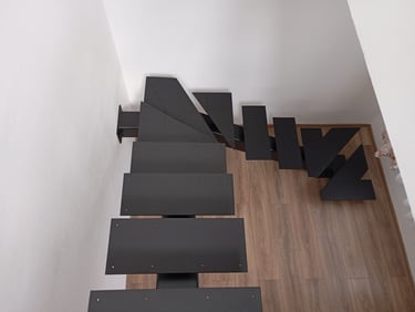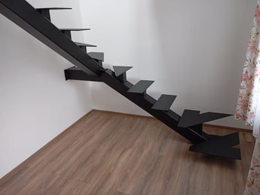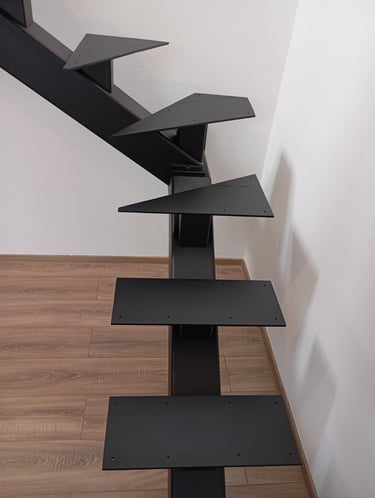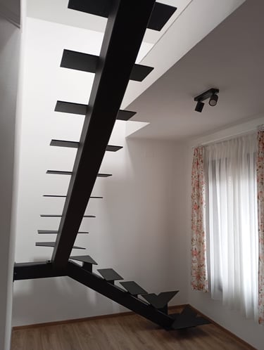 A jól megtervezett födémkivágásnak köszönhetően egy igazán kényelmes és tágas járófelületet alakítottunk ki. A lépcső két főelemből áll, amelyeket színazonos kötőelemekkel rögzítettünk, így egységes és letisztult megjelenést kapott.
