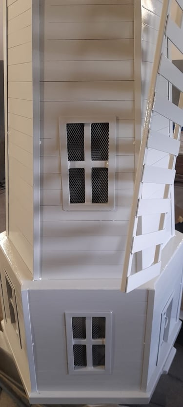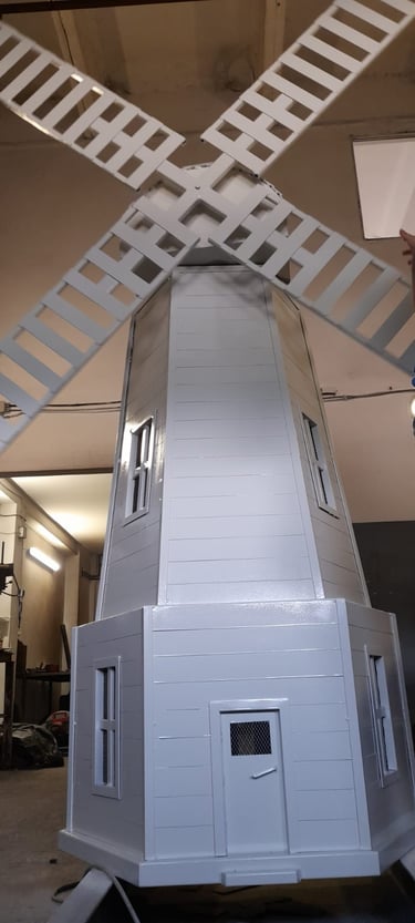 The windmill is about 1.8 meters high, and with the wheel, about 2.5 meters. The base diameter is about 80 cm.